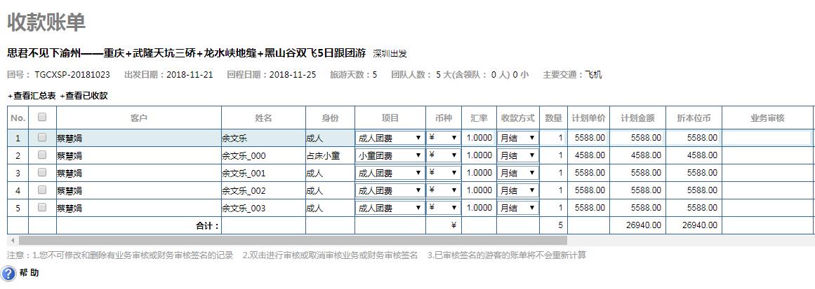 1、当同组报名的游客资料录入系统后,可根据游客身份和人数自动生成收款账单:
