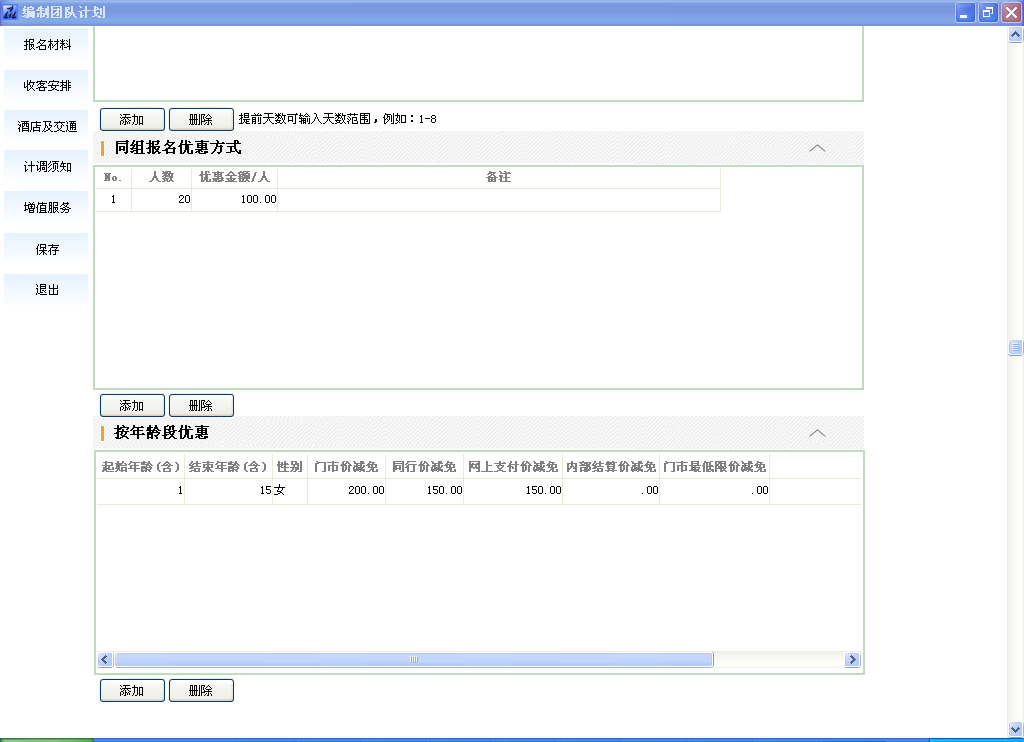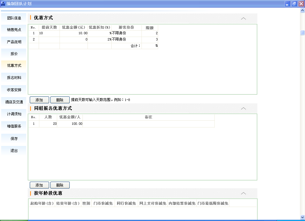 说明:当设置了优惠方式后,提前报名的游客会有优惠,上图中的例子中,对于提前10天报名的前两个客人可以优惠10元;提前20天报名的前3个游客可以打98折。
